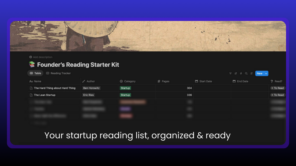 Founder’s Reading Starter Kit is a free Notion template featuring 5 must-read books for early-stage founders. It includes hand-curated summaries, an interactive reading tracker, and a clean layout to help you learn faster and build smarter. Built for indie makers, startup builders, and anyone serious about mastering the founder mindset.