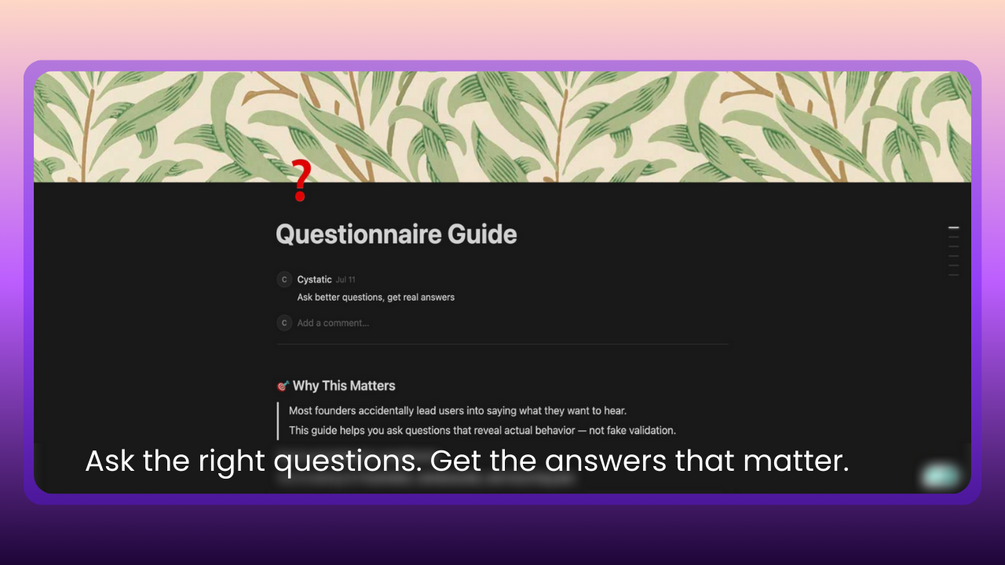 A free Notion-based system to help early-stage founders talk to users, ask better questions, and extract insights that actually guide what to build next. Includes a DM script, conversation guide, and a tracker to log and analyze responses. No fluff, just clarity and structure.